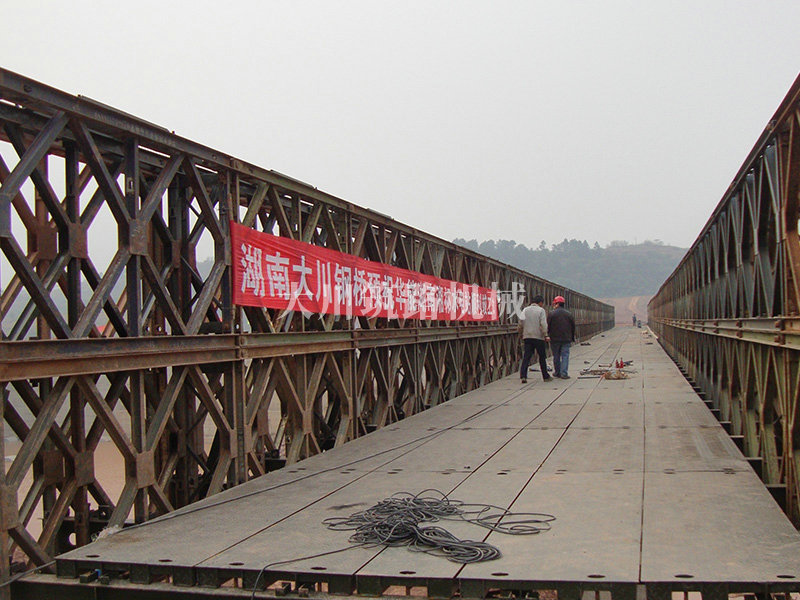 特點(diǎn):滿足荷載50T施工車輛的通行要求。本鋼橋安裝條件復(fù)雜,工期特別緊,我公司精心安排,合理組織,按時(shí)完成了安裝任務(wù)。采用推出吊裝法和推出法結(jié)合安裝,安裝周期23天,通過中南大學(xué)下屬專業(yè)檢測機(jī)構(gòu)檢測。